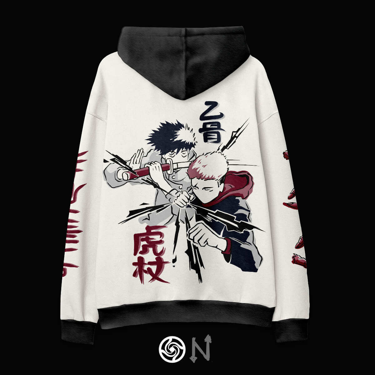 Hoodie JJK, inspirado en Megumi e Itadori de Jujutsu Kaisen. Esta edición limitada combina streetwear y arte gráfico para capturar la esencia oscura y provocadora de la serie. Una fusión de tonos negro y azul, junto a símbolos ocultos y detalles únicos que rinden homenaje al universo del manga.